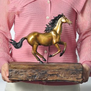 Tượng ngựa để bàn bằng đồng có đế bằng gỗ mộc mạc